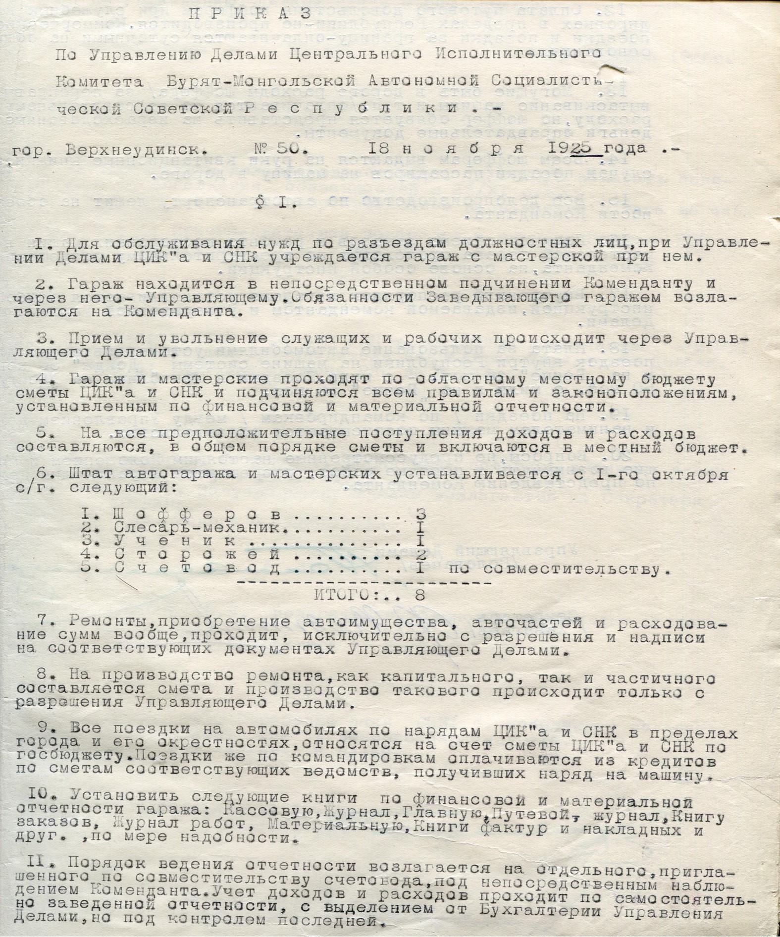Из Приказа Управления Делами Центрального Исполнительного Комитета Бурят-Монгольской Автономной Социалистической Советской Республики: