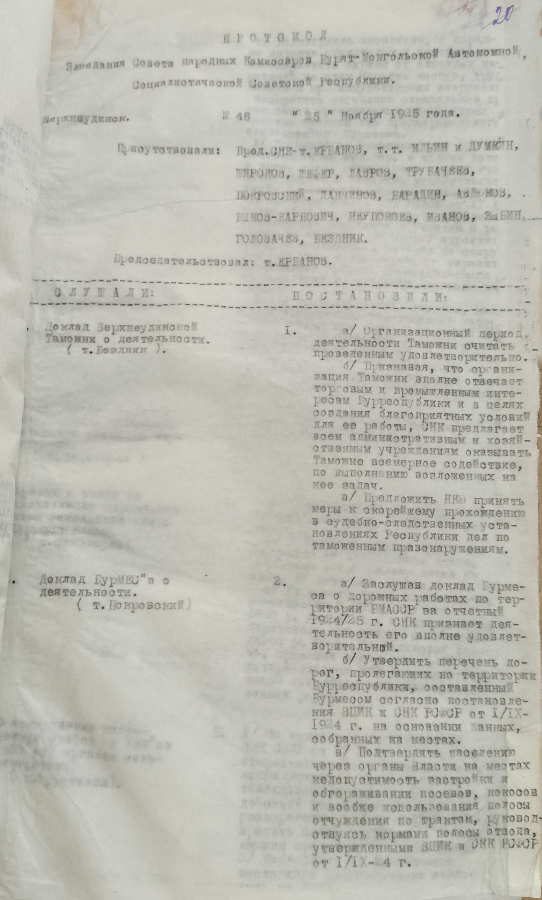 Из Протокола заседания Совета Народных Комиссаров Бурят-Монгольской Автономной Советской Социалистической Республики: