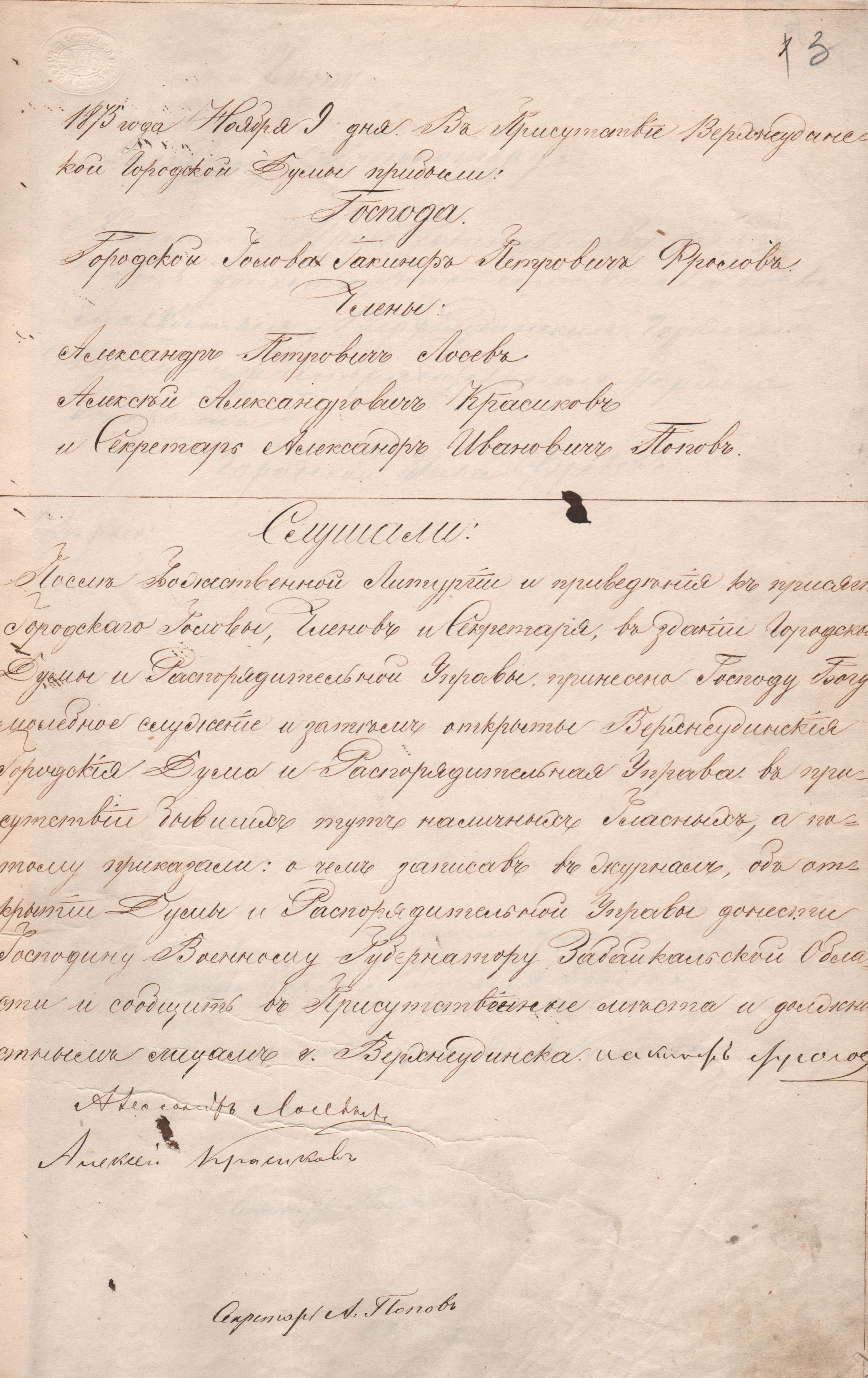 После Божественной литургии и приведения к присяге Городского Головы, членов и секретаря, в здании Городской Думы и Распорядительной Управы, принесена Господу Богу молебное служение и затем открыты Верхнеудинская Городская Дума и Распорядительная Управа в присутствии бывших тут наличных Гласных, а потому приказали: о чем записав в журнал, об открытии Думы и Распорядительной Управы донести Господину Военному Губернатору Забайкальской области <…>».