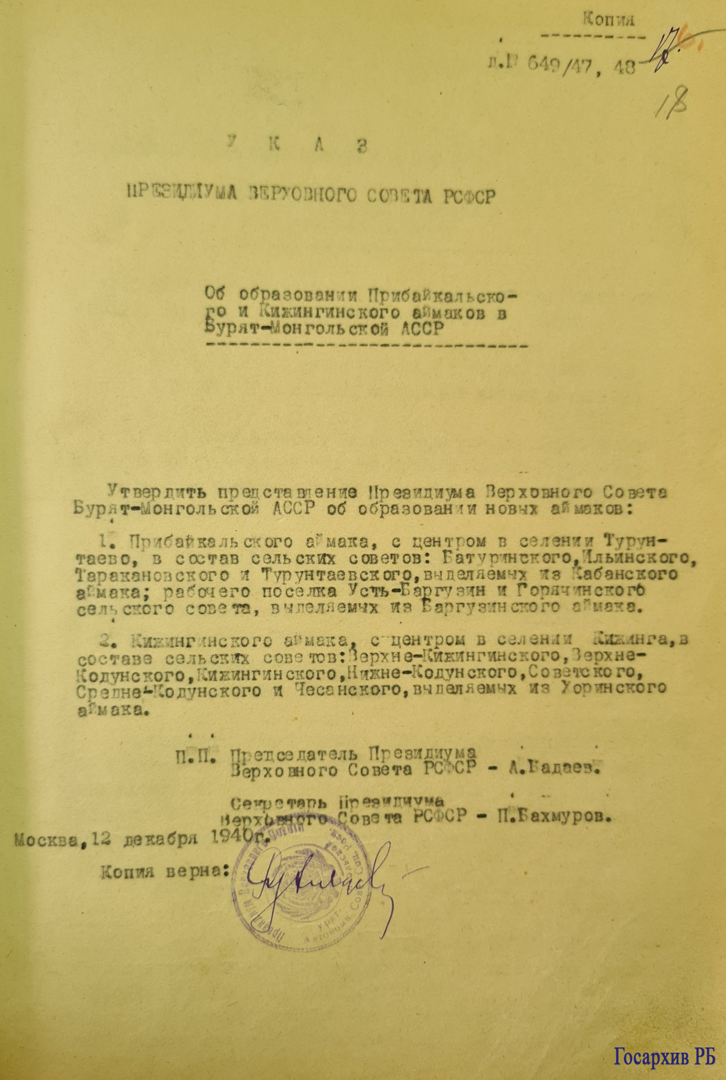 Из Указа Президиума Верховного Совета РСФСР об образовании Прибайкальского и Кижингинского аймаков в Бурят-Монгольской АССР: