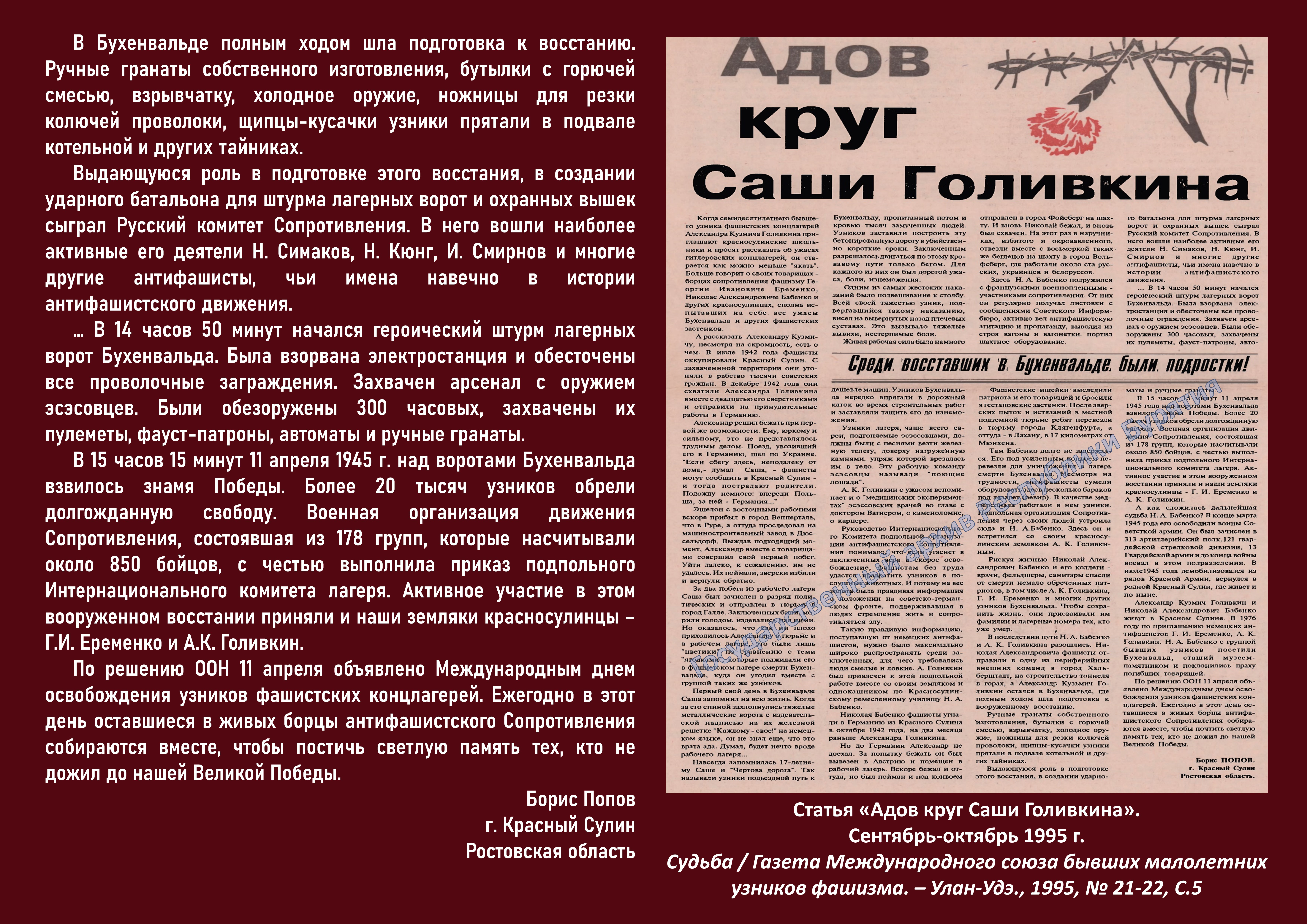 Международный день освобождения узников фашистских концлагерей установлен в память об интернациональном восстании узников концлагеря Бухенвальд, произошедшем 11 апреля 1945 г.