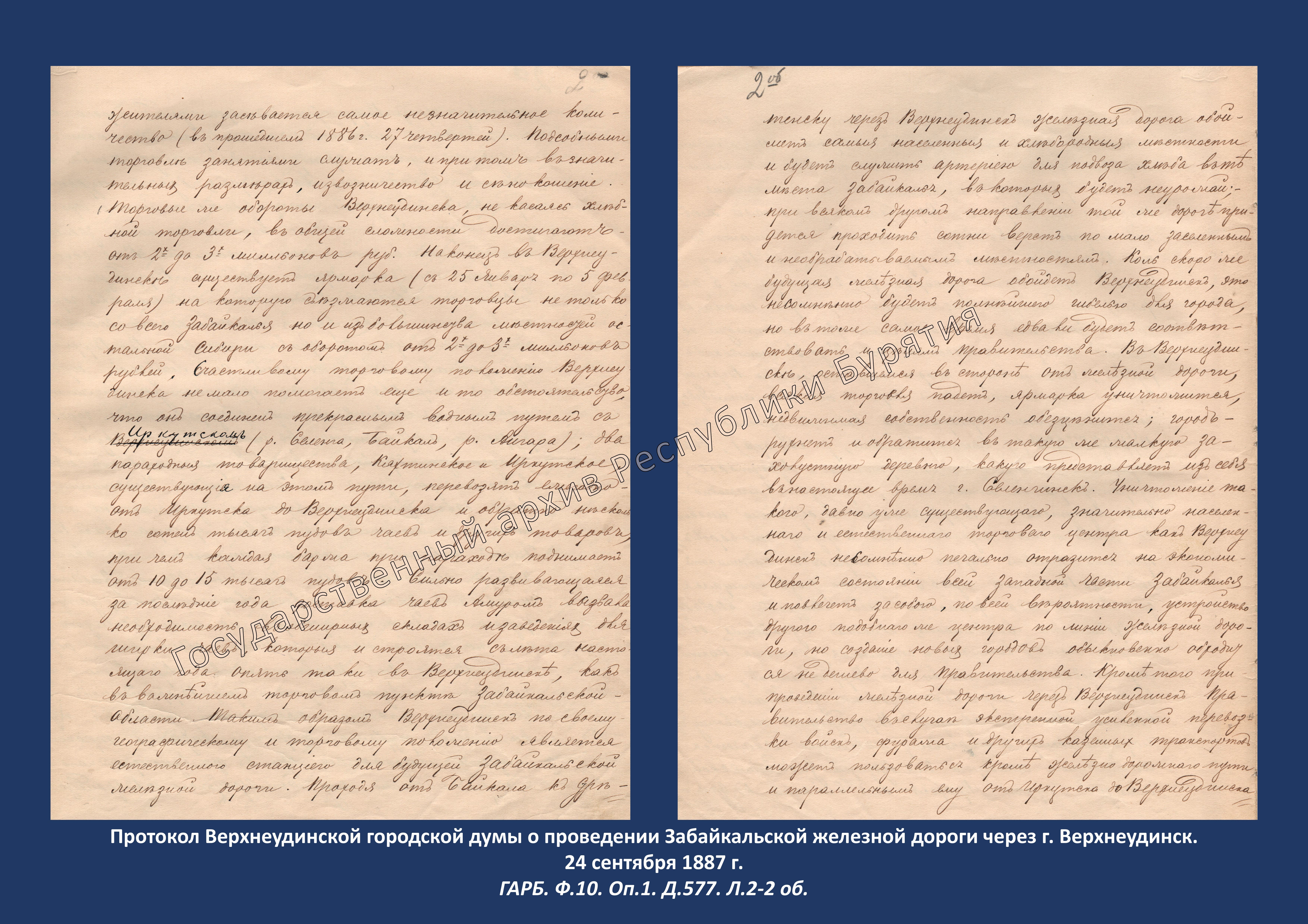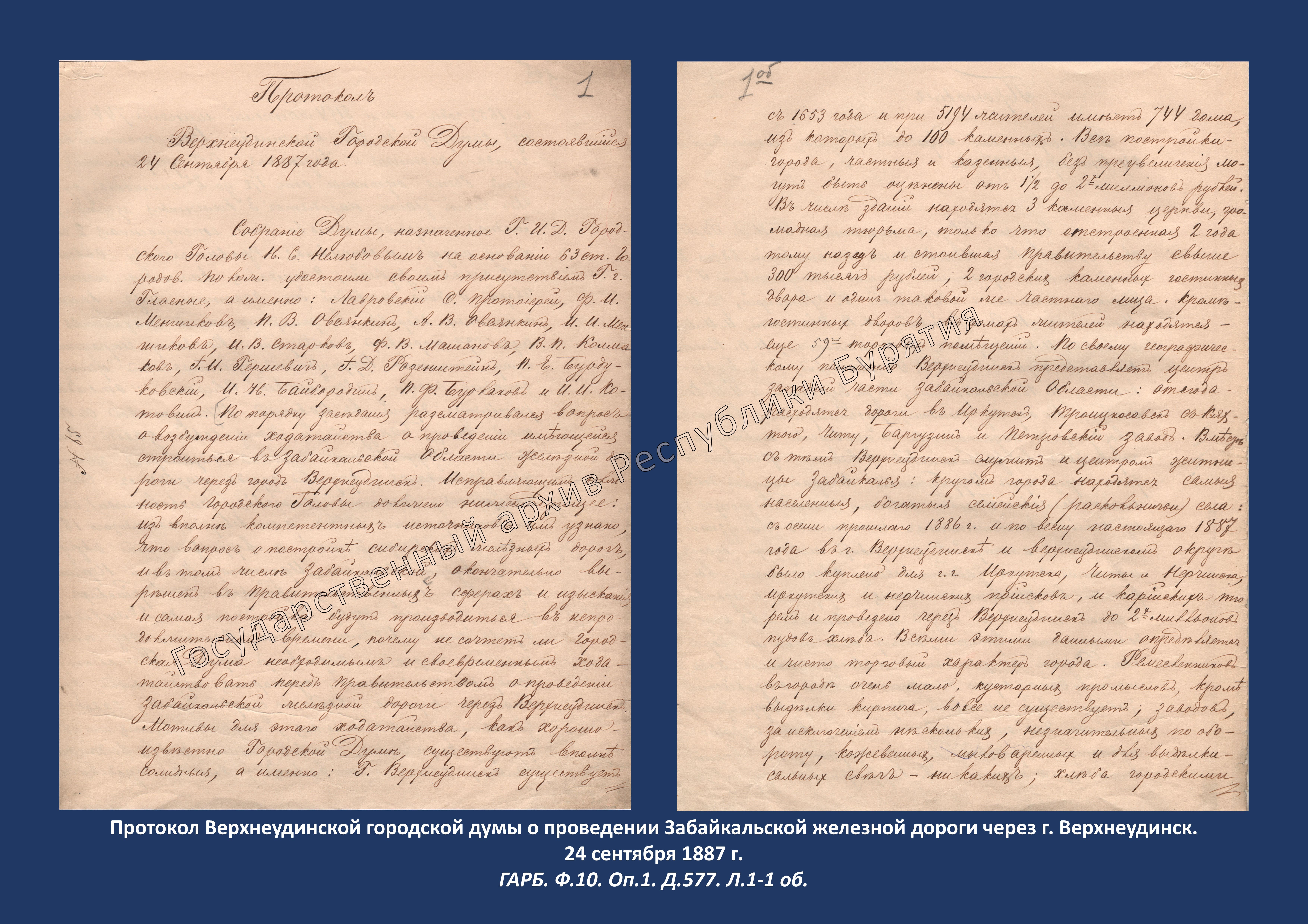 Сегодня для ознакомления выбран документ из фонда Ф.10 «Верхнеудинская городская управа» о проведении Забайкальской железной дороги через г. Верхнеудинск, датированный 24 сентября 1887 г.