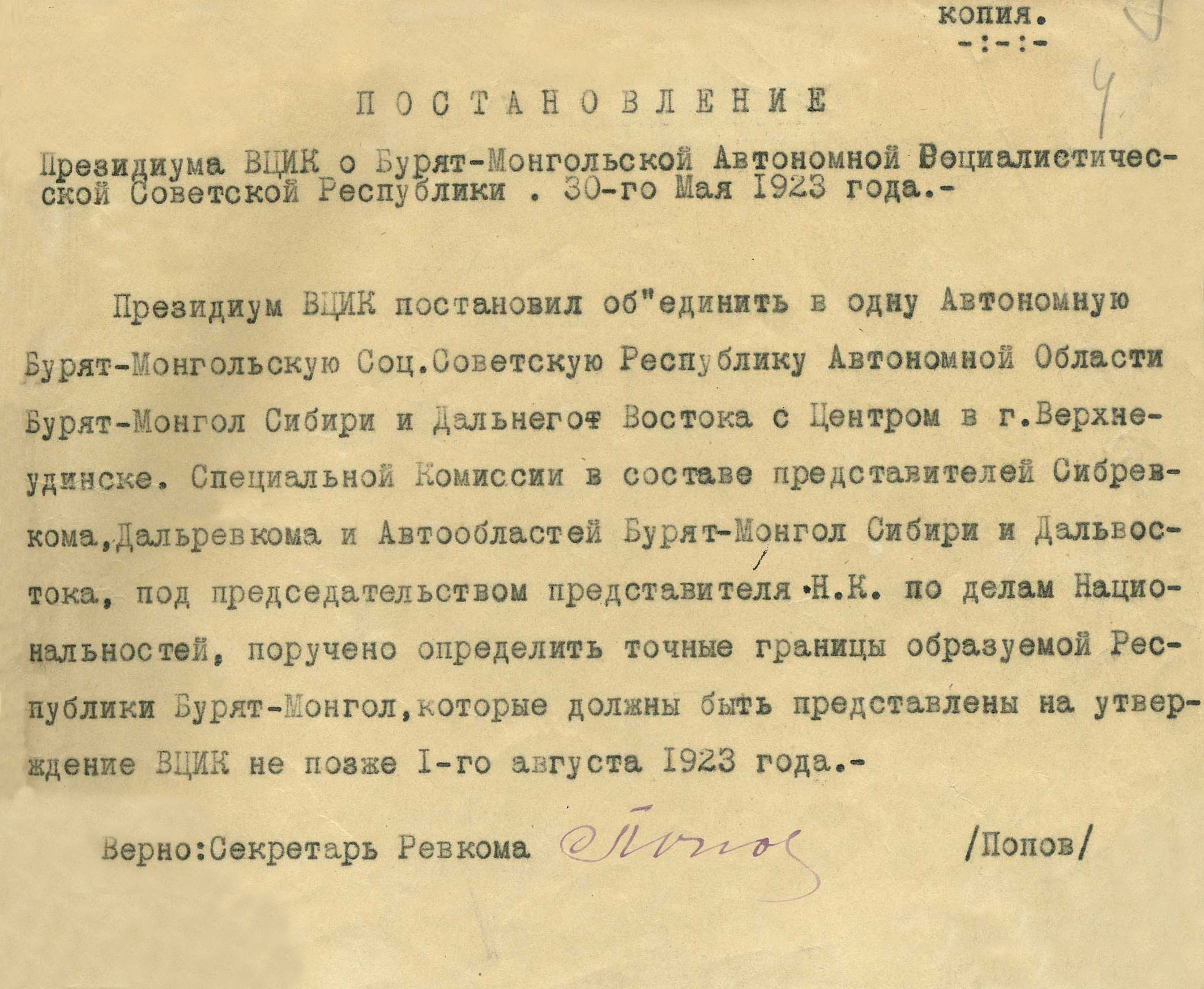 Из постановления Центрального Исполнительного Комитета и Совета Народных Комиссаров Бурят-Монгольской Автономной Советской Социалистической Республики: