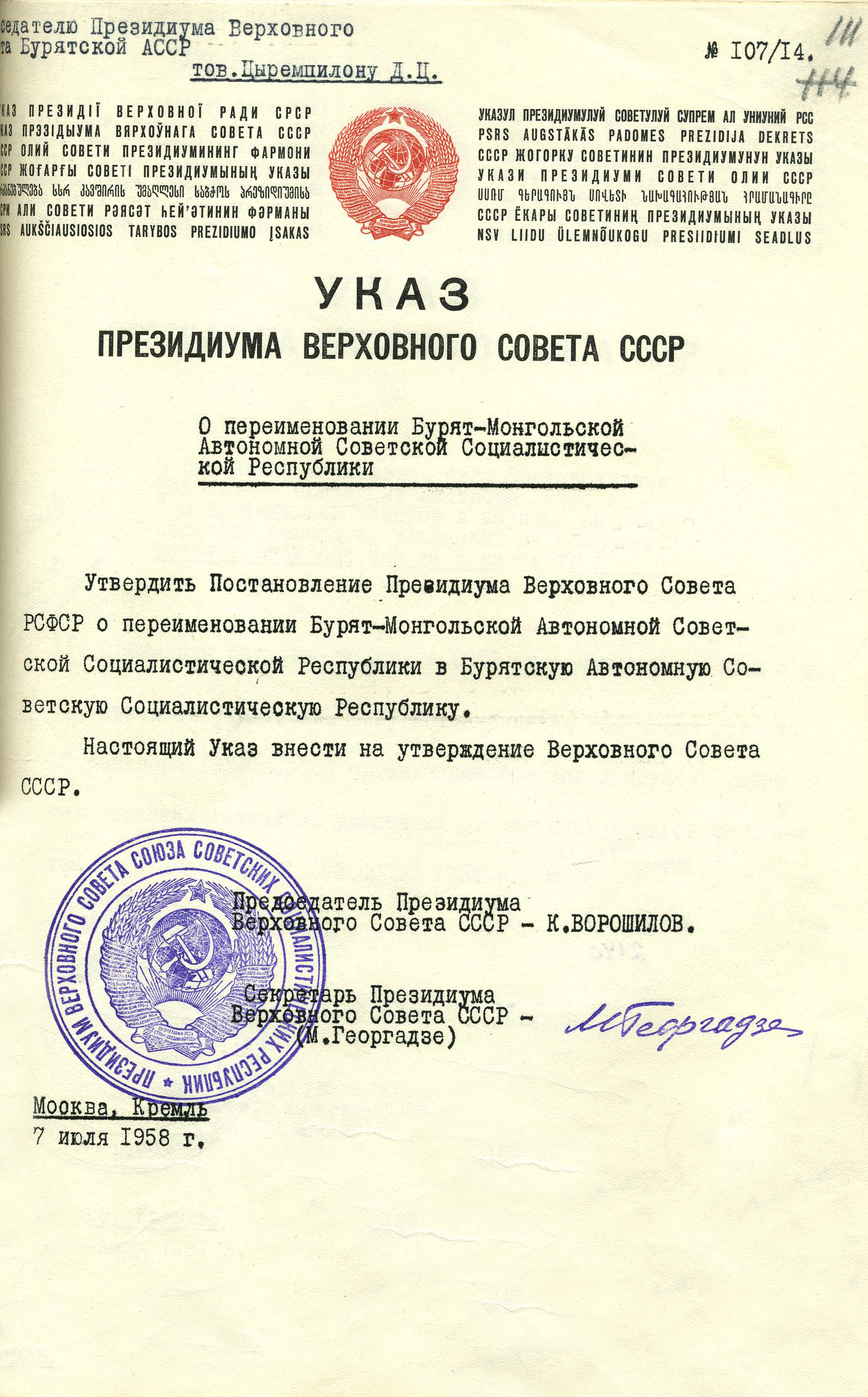 Из Указа Президиума Верховного Совета РСФСР об образовании Прибайкальского и Кижингинского аймаков в Бурят-Монгольской АССР: