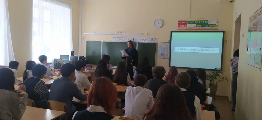 На уроке дети ознакомились с историей развития атомной энергетики в России, узнали об основных событиях и людях, связанных с ликвидацией аварии на Чернобыльской АЭС.