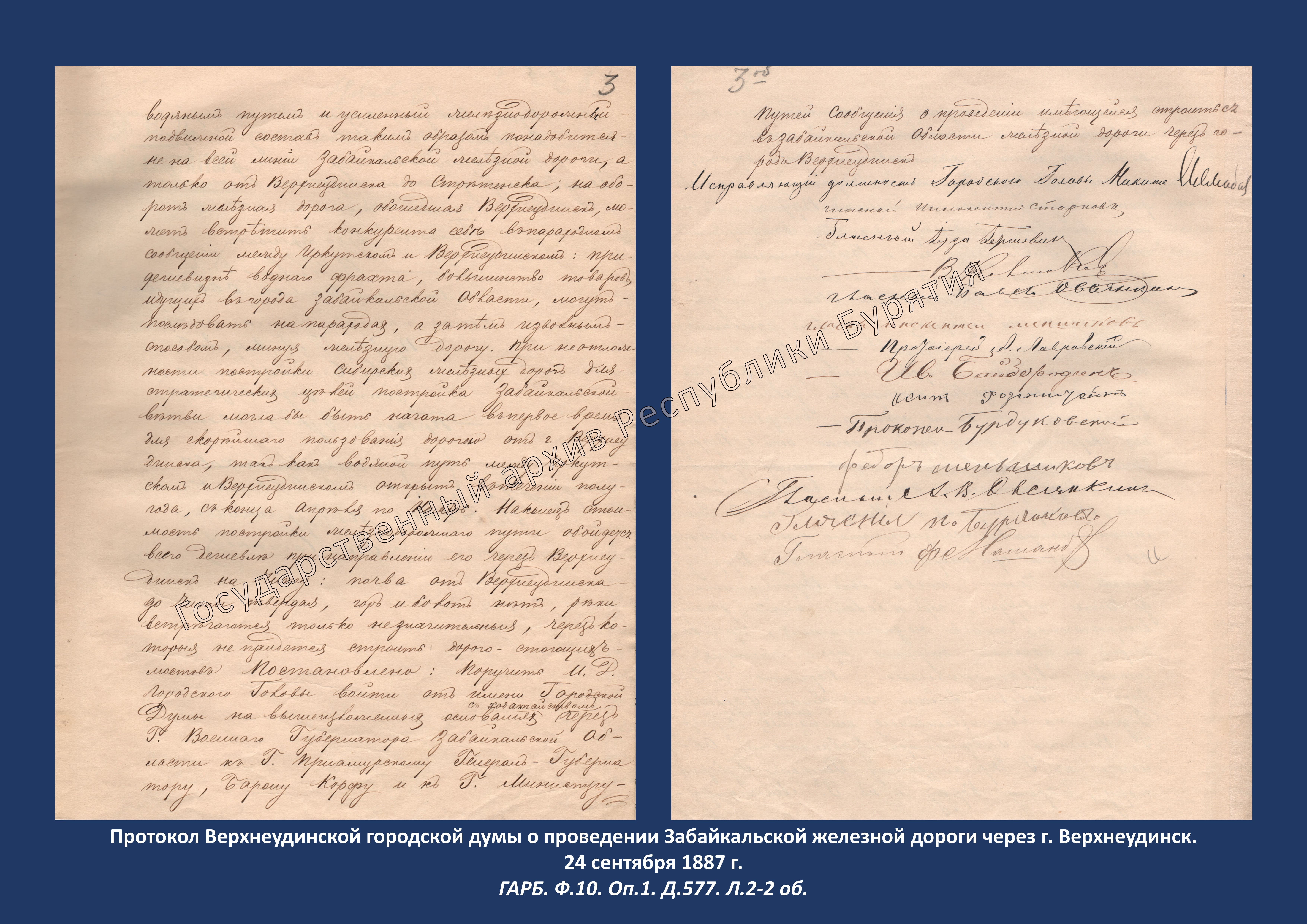 Сегодня для ознакомления выбран документ из фонда Ф.10 «Верхнеудинская городская управа» о проведении Забайкальской железной дороги через г. Верхнеудинск, датированный 24 сентября 1887 г.